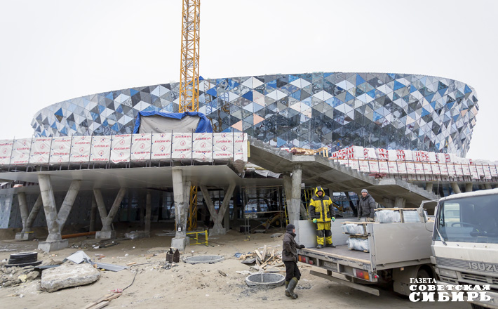 Сейчас прямо посередине будущего ледового поля специалисты собирают каркас огромного медиакуба, который будет висеть под куполом. Общий вес конструкции вместе с мультимедийными экранами составит около девяти тонн. Кстати, экраны уже в Новосибирске и ждут своей очереди.