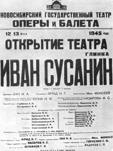 Война отодвинула планы открытия, и день рождения нашего Сибирского колизея принято отмечать 12 мая: именно в этот день шестьдесят пять лет назад театр впервые распахнул свой занавес перед первыми зрителями и слушателями оперы «Иван Сусанин».