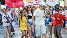 Совершенно изумительная придумка: большой баннер, где с утра все желающие запечатлевали свой привет солнцу и лету, макая ладошку в желтую краску, должен взмыть в небо на огромных воздушных шарах, которые каждая очередная колонна (а их было 37!) привязывала к полотнищу.