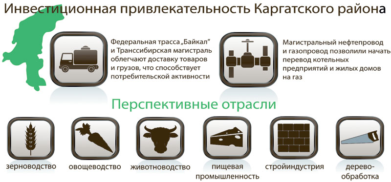 В старину жители Каргатского района дома и дороги строили исключительно из местных материалов. Есть здесь и отличная кирпичная глина, и торф, и деловая древесина. Есть, что очень важно, богатые сельхозугодья. С точки зрения инвестиционной привлекательности район имеет хорошие перспективы. Самим каргатцам будущее развития их родных мест видятся в первую очередь в стабильном источнике заработка и комфортабельности сельского бытия.