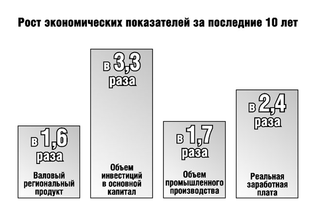 Анатолий Соболев сообщил, что экономика региона имеет высокую степень диверсификации, а валовый региональный продукт области за последние десять лет увеличился в 1,6 раза, объем инвестиций в основной капитал — в 3,3 раза, объем промпроизводства — в 1,7 раза, реальная заработная плата — в 2,4 раза.