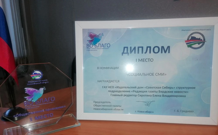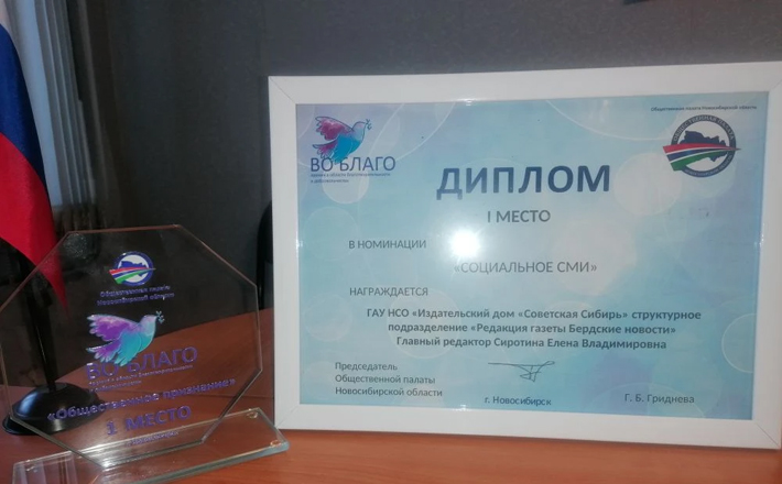 Первая городская газета «Бердские новости», которая в следующем году отметит 95-летие, получила 1-е место в номинации «Социальное СМИ». Коллектив «Бердских новостей», который возглавляет Елена Сиротина, награжден за информационную поддержку добровольческих инициатив города.