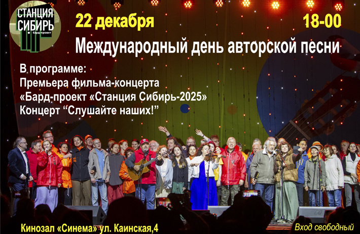 — Это будет уже седьмая серия сибирской бардовской саги, — уточняет Сергей Ревмирович. — В программе — премьера фильма-концерта «Бард-проект «Станция Сибирь — 2025», посвященного прошедшему минувшим летом в Новосибирске одноименному фестивалю авторской песни и седьмой «Сибирской десятке». Фильм создан командой телекомпании ОТС, режиссер — Ольга Морозова.