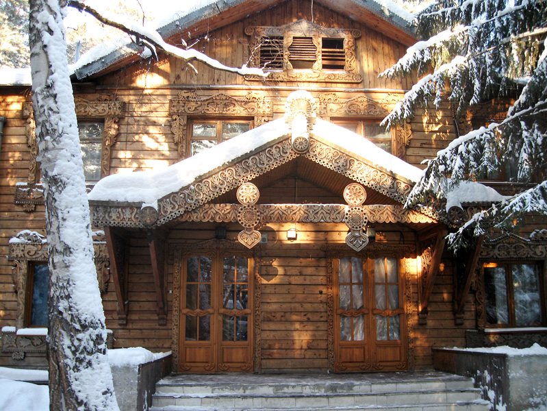 Мы приехали за несколько часов до банкета, чтобы познакомиться с обстановкой. Жилой корпус напоминал сказочный теремок — старинный дом с деревянной резьбой по фасаду. Внутри тепло и уютно. Новогодняя елка, украшенная шарами, тихо журчащий водопад с летней изгородью под лестницей навевали умиротворенное настроение. Массивная деревянная лестница привела нас в уютную комнатку, обставленную на русский манер. И стол, и тумбочка выполнены из дерева с резными окантовками, покрытыми лаком. Тихо и спокойно. Наша тревога по поводу незнакомого места рассеялась.