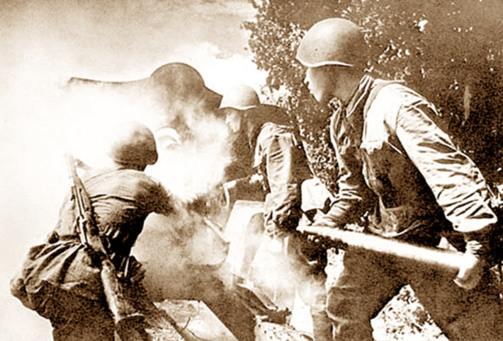 Неудержимой яростью горят глаза солдат-минометчиков. Руки твердо сжимают оружие, мускулы напряжены до предела. На расстоянии двухсот шагов немецкий командир кричит: «Русь, давай командира на переговоры».