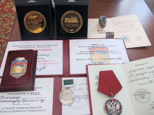 Александр Архипович Флягин — ударник нескольких пятилеток. Как уже упоминалось, лучший рационализатор железнодорожного транспорта. В 2002 году ему был вручен знак МПС «Лучший по профессии» на железнодорожном транспорте. Годом раньше Флягин принимал участие в слете передовиков производства в Москве, где был награжден знаком «100-летие Транссиба» и одноименной памятной медалью. Есть в его копилке и другая памятная медаль — «150-летие открытия движения между Санкт-Петербургом и Москвой». На руке Александр Архипович носит часы начальника дороги: идут точно. А самой высокой наградой, сделавшей его пенсионером федерального значения, стала медаль ордена «За заслуги перед Отечеством» второй степени.
