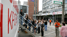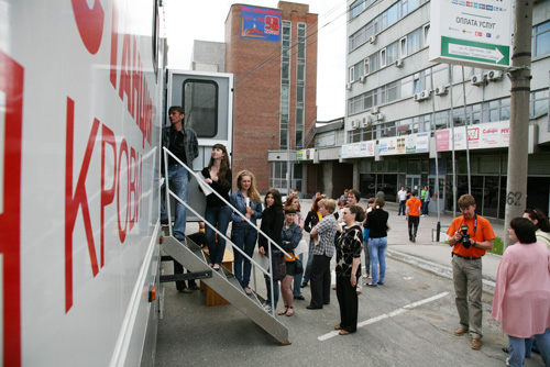 Мобильный пункт заготовки крови на колесах, мощный трейлер с очень большим грузовым отсеком, припарковался у здания издательства «Советская Сибирь», где располагается ряд крупнейших СМИ и рекламных агентств, уже в 8 утра. В Новосибирской области такой передвижной пункт —