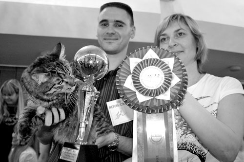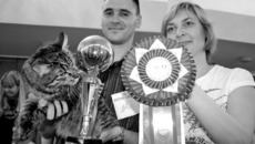 «Это Цельсиор, — отрекомендовывает своего питомца, победителя среди курильских бобтейлов, житель Новосибирска Юрий Сафронов. — В домашней обстановке — Цезя. Он еще котенок, ему семь месяцев, так что пока мы в юниорах. Котов держали всегда, но в выставке участвуем впервые. Пробный шар оказался удачным, надеюсь, будем продолжать карьеру, стремиться к новым высотам». Интересно, а какой характер у этого бобтейла? «Он очень активный, игривый, в сущности, кот-компаньон, все время хвостиком за тобой бегает, как собака! — улыбается хозяин. — А еще хорошо заменяет будильник». «Целоваться любит», — весело дополняет Елена, супруга Юрия. Который сам, к слову сказать, работает администратором ювелирного магазина. Так что глаз алмаз: к выбору питомца, судя по всему, подход оказался соответствующим. До ювелирного утонченным! Цезя тоже доволен…