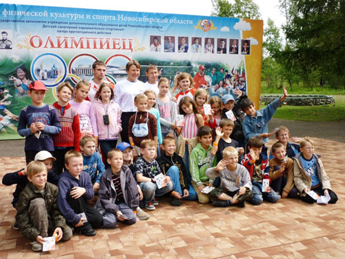 После линейки, на которой Евгений Подгорный и Анна Богалий-Титовец под звучащий гимн лагеря торжественно подняли флаг «Олимпийца», все дети (а в лагере отдыхают более двухсот человек) отправились на футбольное поле, где вместе с гостями выполнили комплекс развивающих упражнений. После разминки ребята соревновались в беге, прыжках, испытывали ловкость и силу в командных состязаниях. Капитанами команд, конечно же, стали олимпийцы.