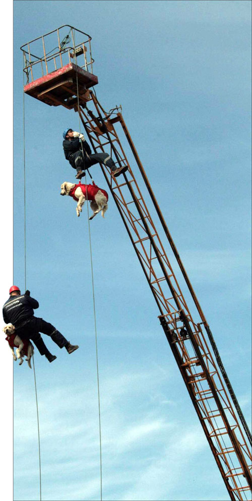 Смиренно-меланхолично псы во всем своем «парашютном» снаряжении зависают метрах в тридцати над землей. Лапками никто не сучит, головой лихорадочно не вертит — к экстриму все привычны. В сопровождении своих мужественных хозяев, бойцов Новосибирской областной аварийно-спасательной службы, столь же доблестная мохнатая гвардия спускается на специальных тросах в зону условного бедствия, дабы приступить затем к поиску и спасению «пострадавших». Такой наряд, обыкновенно, прибывает в труднодоступные районы вертолетом, который в данном случае имитирует автовышка. С приземлившихся четвероногих десантников снимают обмундирование и дают им отбой: к счастью, сегодня выручать никого не нужно — это только шоу. И тотчас же состояние предбоевой сосредоточенности сменяется у них, храбрых лабрадоров ретриверов, классической собачьей радостью (еще и усугубленной лакомством). Прыжки, карусельный кайф в погоне за собственным хвостом, жизнеутверждающий лай...