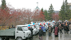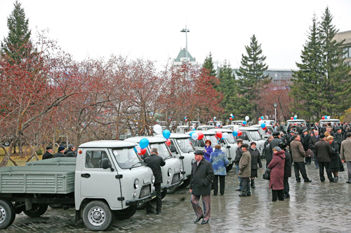 Из большого зала правительства области праздник плавно перемещается на площадку перед театром оперы и балета. Здесь уже с утра многолюдно. Новосибирцы с интересом проходят вдоль рядами стоящих автомобилей, тракторов, которые предназначены для передачи лучшим районам и хозяйствам области. Руководители области обходят строй машин, разговаривают с победителями соревнования, благодарят, говорят слова напутствия и, конечно же, передают технику в дар селянам.