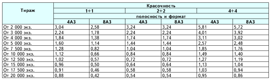 цены указаны в рублях с учетом НДС на услуги печати без учёта стоимости бумаги. Потребность бумаги рассчитывается по внутриотраслевым нормативам. Стоимость бумаги с учётом НДС: