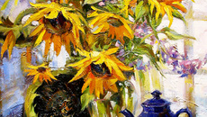 Удивительный эффект: большинство создателей представленных на этой выставке работ, на мой взгляд, настолько самобытны, зрелы и профессионально состоятельны, что почти все увиденное на вернисаже запомнилось до нюансов, до деталей. Как, например, листы с эскизами костюмов к спектаклям Новосибирского театра музыкальной комедии Анны Сорокиной. Тотчас вспоминаешь и сами спектакли — «Ходжа Насреддин», «Труффальдино», «Холопка» и многие другие, которым смелый и яркий дар художницы придал немалую долю убедительности и очарования. Или акварели Ольги Михалевой — преподавателя школы искусств из рабочего поселка Маслянино. Они экспонировались в разных новосибирских выставочных залах не раз и не два, автор — десятикратный лауреат областных выставок среди своих коллег. Но одна крошечная, 29 на 15 сантиметров, сельская картинка под названием «Домой» (закат, в неясных лучах солнца и пыльном облаке бредет домой деревенское стадо) настолько изящна, выразительна и полна живого чувства, что к ней применимо лишь одно определение — шедевр…
