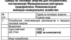 1. Установить тарифы на тепловую энергию, поставляемую Муниципальным унитарным предприятием «Новоникольское жилищно-коммунальное хозяйство» (ОГРН 1095468000154, ИНН 5416104175) потребителям, согласно приложению.