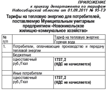 В соответствии с Федеральным законом от 27.07.2010 № 190-ФЗ «О теплоснабжении», постановлением Правительства Российской Федерации от 26.02.2004 № 109 «О ценообразовании в отношении электрической и тепловой энергии в Российской Федерации», приказом Федеральной службы по тарифам от 06.08.2004 N 20-э/2 «Об утверждении методических указаний по расчету регулируемых тарифов и цен на электрическую (тепловую) энергию на розничном (потребительском) рынке», приказом Федеральной службы по тарифам от 08.04.2005 № 130-э «Об утверждении Регламента рассмотрения дел об установлении тарифов и (или) их предельных уровней на электрическую (тепловую) энергию (мощность) и на услуги, оказываемые на оптовом и розничных рынках электрической (тепловой) энергии (мощности)», приказом Федеральной службы по тарифам от 07.10.2010 № 244-э/2 «Об установлении предельных максимальных уровней тарифов на тепловую энергию, поставляемую энергоснабжающими организациями потребителям, в среднем по субъектам Российской Федерации на 2011 год», постановлением Губернатора Новосибирской области от 18.10.2010 № 326 «О департаменте по тарифам Новосибирской области» и решением правления департамента по тарифам Новосибирской области (протокол заседания правления от 01.09.2011 № 37) департамент по тарифам Новосибирской области приказывает: