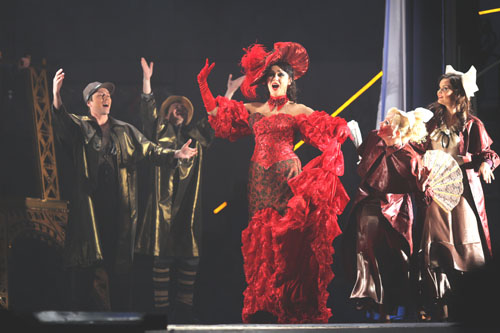 Чтобы подчеркнуть вневременную актуальность истории, произошедшей полтора века назад, режиссер спектакля Александр Лебедев под именами парижских графов и министров в облике ростовых кукол выводит на сцену современных медийных персонажей — Николая Баскова, Анастасию Волочкову, Аллу Пугачеву, Сильвио Берлускони, Барака Обаму и других, не менее известных персон.