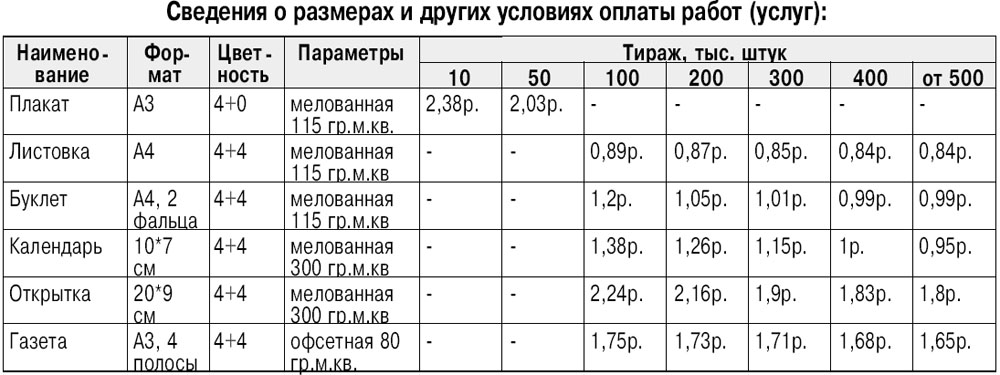 Стоимость изготовления агитационных материалов может меняться в зависимости от тиража, красочности изображения, типа используемых материалов. Возможно изготовление полиграфической продукции нестандартных размеров, с тиснением, конгревом, выборочной УФ-лакировкой, ламинацией, перфорацией. Расчет производится согласно техническому заданию и оформляется в виде калькуляции.