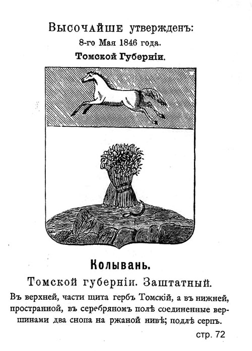При назначении губернским городом Западно-Сибирского генерал-губернаторства в 1822 году Колывань получила герб. Да не могло у неё быть губернского герба! На его разработку и утверждение царем потребовались бы годы. А Колывань из-за саботажа чиновников Томска на следующий год перевели в ранг окружного города. И лишь в этом качестве 8 (20) мая 1846 года город обрел герб, утверждённый Николаем I. Работая в Свердловске, я встретил в киоске значок с изображением этого герба и сразу понял, что он принадлежит именно чаусской Колывани: в верхней половине щита изображен белый конь — герб губернского Томска. В 1974 году директору колыванского музея это подтвердили в Томском архиве. А сейчас его выдают нам за герб губернской столицы Колывань. При этом некоторые кандидаты и доктора наук несут ненаучную отсебятину: то обнаружат в нём «рог изобилия», то потеряют один сноп, то описывают геральдические фигуры, как на ум взбредет. А что б не заглянуть в гербовник фон Винклера из того же Полного собрания законов, переизданный в 1990 году? Здесь герб Колывани Томской губернии описан уже как атрибут города заштатного: «В верхней части щита герб Томский, а в нижней, пространной, в серебряном поле соединенные вершинами два снопа на ржаной ниве, подле серп».