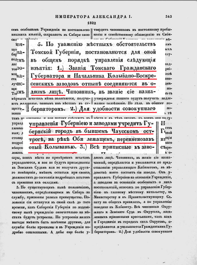 «5. По уважению местных обстоятельств Томской Губернии, постанавливаются для оной в общем порядке управления следующие изъятия: 1) Звания Томского Гражданского Губернатора и Начальника Колывано-Воскресенских заводов отныне соединяются в одном лице. Чиновник, в звание сие назначаемый, определяется и увольняется по представлению управляющего Кабинетом, в ведомстве коего состоят сии заводы. 2) Для удобности совокупного управления Губерниею и заводами учредить губернский город в бывшем Чаусском остроге, на реке Оби лежащем, переименовав оный Колыванью».