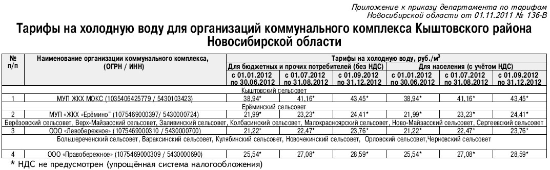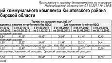 1. Установить тарифы на холодную воду для организаций коммунального комплекса Кыштовского района Новосибирской области с календарной разбивкой согласно приложению (см таблицу 1).