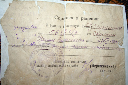 Несмотря на столь серьезные ранения, домой наш герой вернулся не скоро. По излечении он прослужил еще два года во Львовском военном округе и демобилизовался лишь в конце декабря сорок пятого. А о том памятном бое в ночь на 11 августа сорок третьего года ему и сегодня напоминают не только старые раны, но и орден Отечественной войны, который он получил в Москве из рук заместителя Председателя Верховного совета СССР Николая Шверника.