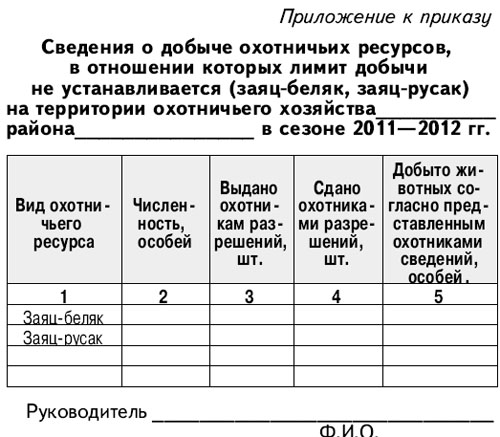 5. Юридическим лицам, государственным инспекторам (ведущим специалистам) департамента представить отчеты о проведении осенне-зимней охоты на зайцев (беляк, русак) в департамент по форме, утвержденной п. 4 настоящего приказа.