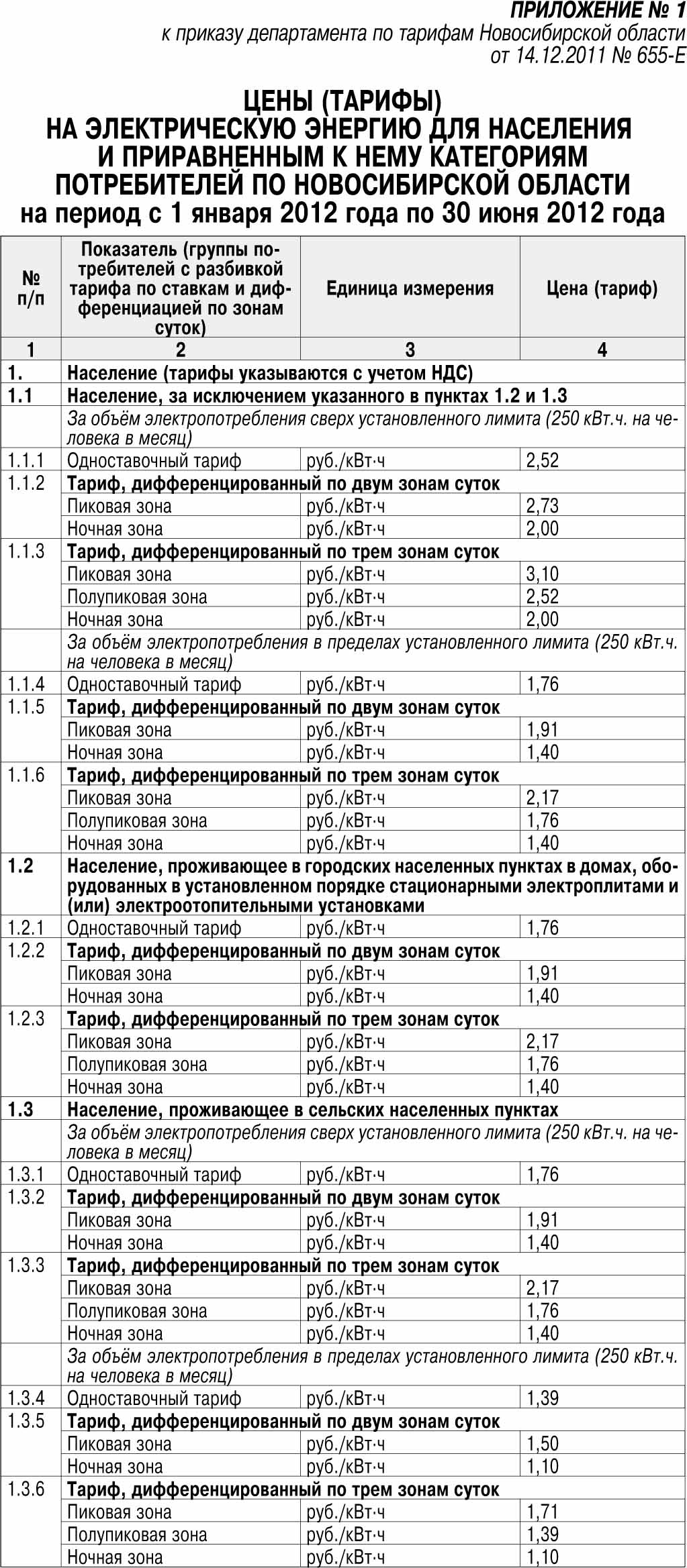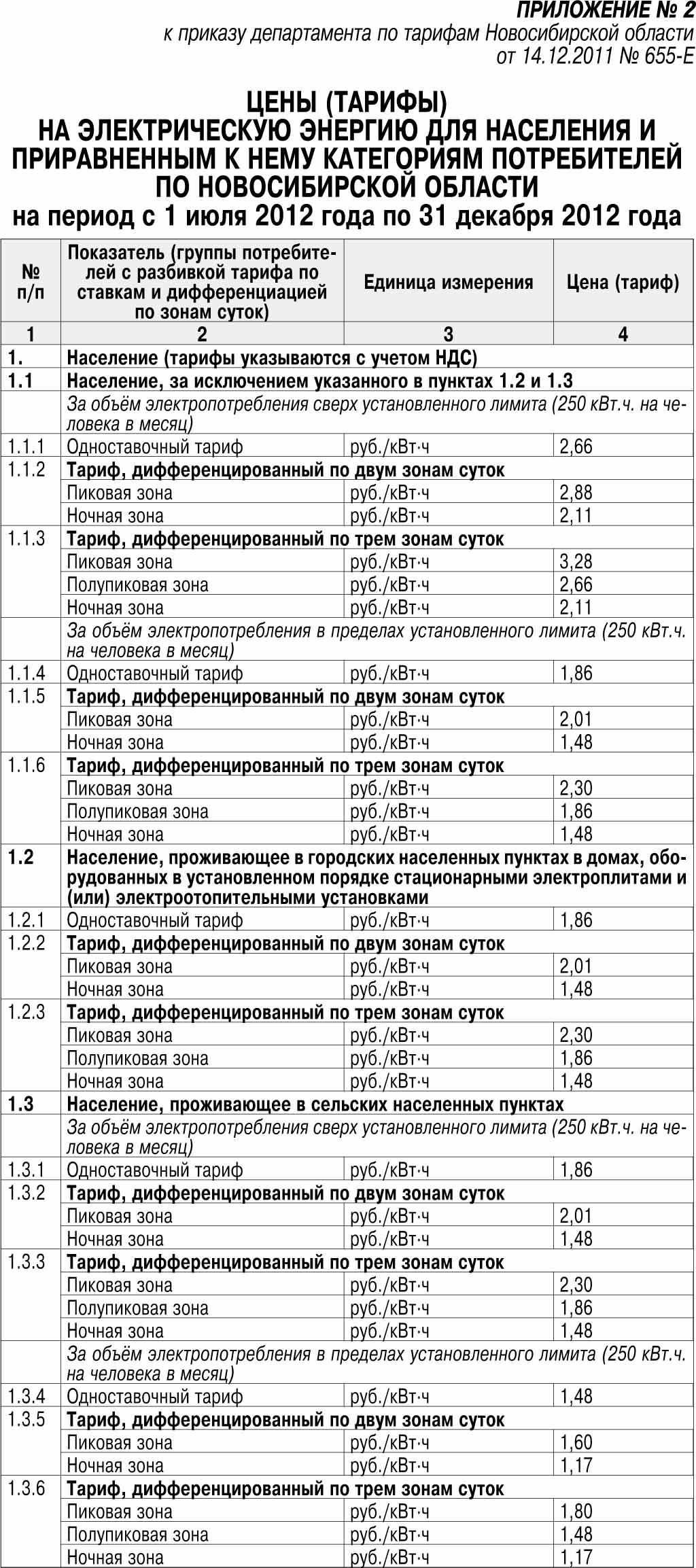 Тарифы на электрическую энергию, предусмотренные в Приложении 1, применяются при расчётах за электрическую энергию, поставляемую населению и потребителям, приравненным к категории население, гарантирующими поставщиками, энергоснабжающими и энергосбытовыми организациями, осуществляющими деятельность на территории Новосибирской области.