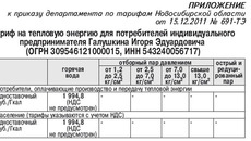 В соответствии с Федеральным законом от 27.07.2010 № 190-ФЗ «О теплоснабжении», постановлением Правительства Российской Федерации от 26.02.2004 № 109 «О ценообразовании в отношении электрической и тепловой энергии в Российской Федерации», приказом Федеральной службы по тарифам от 06.08.2004 № 20-э/2 «Об утверждении методических указаний по расчету регулируемых тарифов и цен на электрическую (тепловую) энергию на розничном (потребительском) рынке», приказом Федеральной службы по тарифам от 08.04.2005 № 130-э «Об утверждении Регламента рассмотрения дел об установлении тарифов и (или) их предельных уровней на электрическую (тепловую) энергию (мощность) и на услуги, оказываемые на оптовом и розничных рынках электрической (тепловой) энергии (мощности)», приказом Федеральной службы по тарифам от 06.10.2011 № 242-э/7 «Об установлении предельных максимальных уровней тарифов на тепловую энергию, поставляемую теплоснабжающими организациями потребителям, в среднем по субъектам Российской Федерации на 2012 год», постановлением Губернатора Новосибирской области от 18.10.2010 № 326 «О департаменте по тарифам Новосибирской области» и решением правления департамента по тарифам Новосибирской области (протокол заседания правления от 15.12.2011 № 63) департамент по тарифам Новосибирской области приказывает: