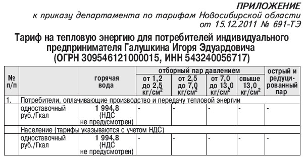 1. Установить тариф на тепловую энергию (мощность) для потребителей индивидуального предпринимателя Галушкина Игоря Эдуардовича (ОГРН 309546121000015, ИНН 543240056717) согласно приложению (см. таблицу 1).