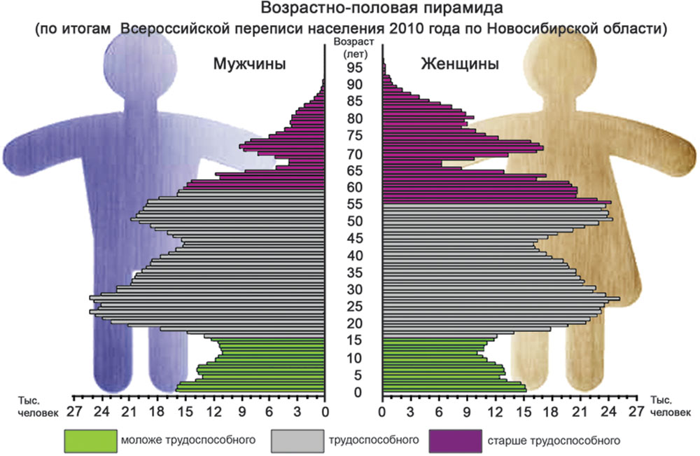 Уже сейчас средний возраст населения области составляет 39,2 года. Причем сильная половина населения Новосибирской области в общем составе моложе: средний возраст мужчин составляет 36,5 года, а женщин — 41,5. В основном дамский перевес приходится на долю старшего поколения. До 30-летнего возраста количество женщин и мужчин приблизительно одинаково. Когда же мы перешагиваем возрастной порог, численность кавалеров неуклонно сокращается. Так что выйти замуж девушке, которой стукнуло два раза по пятнадцать, уже представляется делом непростым.