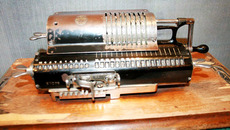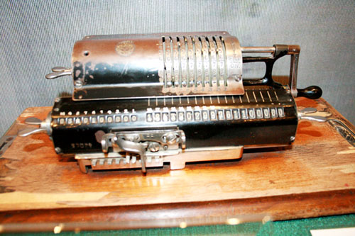 — У нас три арифмометра, — объясняет Алексей Пронин. — Это тот аппарат, который сейчас свои функции утратил и не используется. Грубо говоря, это механический калькулятор для арифметических вычислений — сложения, вычитания, деления. Использовался он вплоть до конца 70-х годов. Тогда ему на смену начали приходить первые калькуляторы. Кстати, один из первых таких калькуляторов стоит у окна (кандидат исторических наук показывает на экспонат, весьма напоминающий печатную машинку с наименьшим набором клавиш): с клавиатуры набирали числа, выбирали действие, а затем это всё распечатывается. Конечно, плёночные упаковщики, брошюровщики, которые оборачивают пачки купюр, монетно-счётные машины — всё это сейчас существует, пусть и не в таком виде.