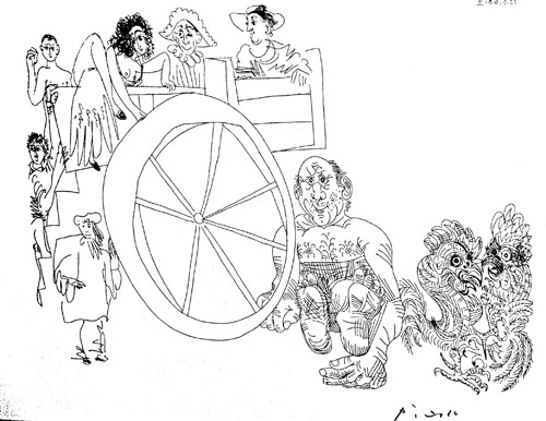 Цирк, коррида, литературные герои, персонажи мировой истории и мифологии, а также Художник (в широком смысле, а порой и сам Пикассо) экспрессивно и провокативно представлены на этих листах в сопряжении с яркой, чувственной доминантой — обнаженным женским телом. Эти композиции полны графического изящества (легкость и кантиленная непрерывность линий), мудрого юмора и неподражаемого жизнелюбия. Тут уместно привести еще одно высказывание Пикассо: «Мы не стареем. Мы созреваем». В ту пору, на пороге 90-летия, он действительно все знал, все видел (через оболочки, одежды, личины), все умел. Как юноша, восхищался красотой и, как мэтр, иронизировал над скрытыми пружинами порой довольно церемонных на вид ситуаций.