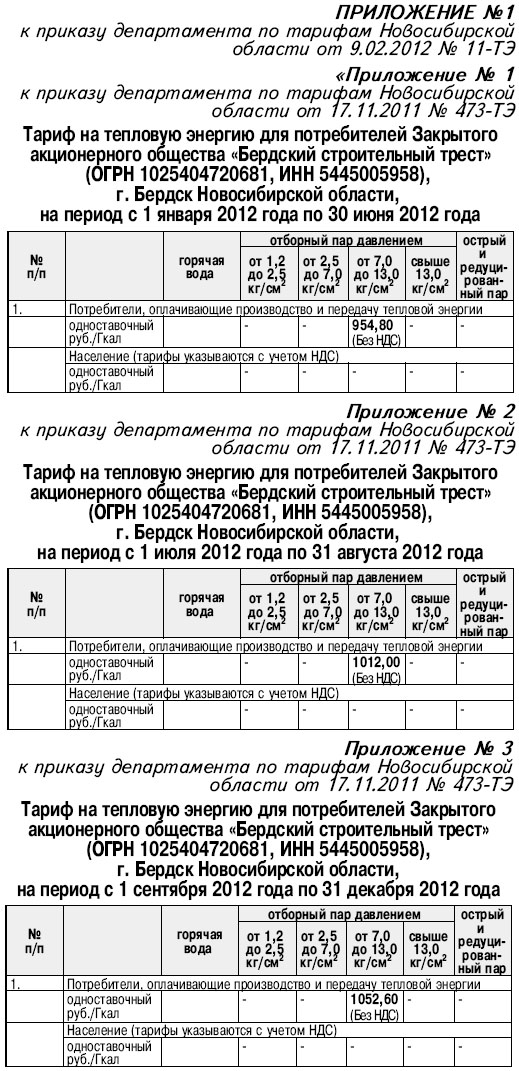 1. Внести в приказ департамента по тарифам Новосибирской области от 17.11.2011 № 473-ТЭ «Об установлении тарифа на тепловую энергию (мощность), поставляемую Закрытым акционерным обществом «Бердский строительный трест» потребителям» следующие изменения: