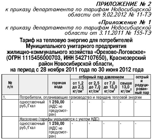 2. Внести изменения в Приложение № 1 к приказу департамента по тарифам Новосибирской области 03.11.2011 № 155-ТЭ «Об установлении тарифа на тепловую энергию (мощность), поставляемую Муниципальным унитарным предприятием жилищно-коммунального хозяйства «Орехово-Логовское» потребителям», изложив его в новой редакции согласно Приложению № 2 к настоящему приказу. (см. таблицу 2)