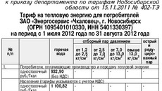 1. Установить тариф на тепловую энергию (мощность) для потребителей Закрытого акционерного общества «Энергосервис «Чкаловец» (ОГРН 1095401010330, ИНН 5401330397), оплачивающих производство тепловой энергии (получающих тепловую энергию на коллекторах производителей), с календарной разбивкой в следующем размере: