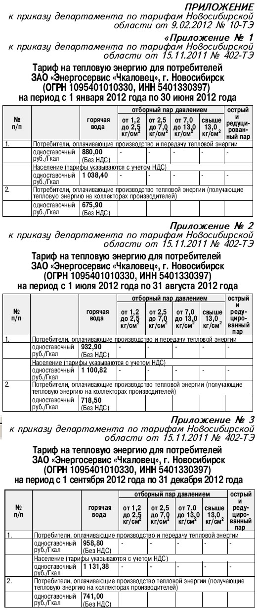 3. Внести в приказ департамента по тарифам Новосибирской области от 15.11.2011 № 402-ТЭ «Об установлении тарифа на тепловую энергию (мощность), поставляемую Закрытым акционерным обществом «Энергосервис «Чкаловец» потребителям», следующие изменения: