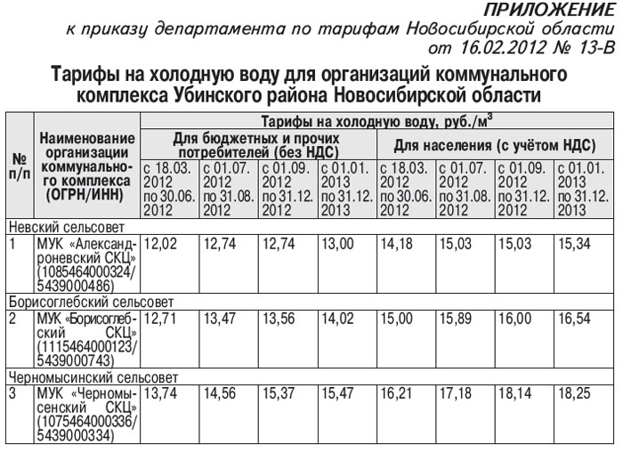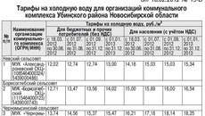 1. Установить тарифы на холодную воду для организаций коммунального комплекса Убинского района Новосибирской области с календарной разбивкой согласно приложению (см. таблицу 1)