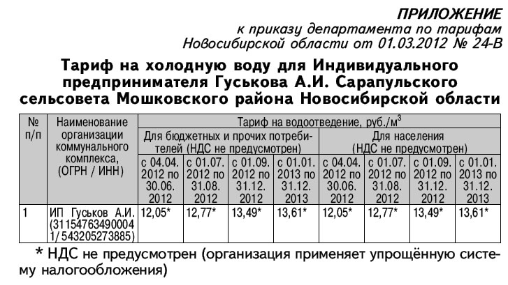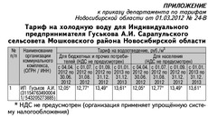 1. Установить тариф на холодную воду для Индивидуального предпринимателя Гуськова А.И. (ОГРН 311547634900041, ИНН 543205273885) с календарной разбивкой согласно приложению (см. таблица 1).