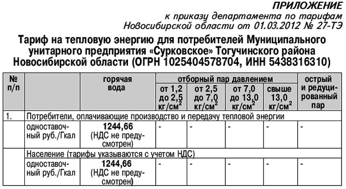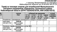 1. Установить тариф на тепловую энергию (мощность) для потребителей Муниципального унитарного предприятия «Сурковское» (ОГРН 1025404578704, ИНН 5438316310) согласно приложению (см. таблицу 1)