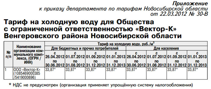 1. Установить тариф на холодную воду для Общества с ограниченной ответственностью «Вектор-К» (ОГРН 1085469000385, ИНН 5419000696), оказывающего услуги на территории села Венгерово Венгеровского района Новосибирской области с календарной разбивкой согласно приложению (см. таблицу 1)