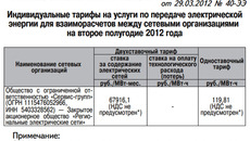 1. Установить индивидуальные тарифы на услуги по передаче электрической энергии для взаиморасчётов между сетевыми организациями Обществом с ограниченной ответственностью «Сервис-групп» (ОГРН 1115476052966, ИНН 5403328562) и Закрытым акционерным обществом «Региональные электрические сети» на второе полугодие 2012 года согласно Приложению (см. таблицу 1)