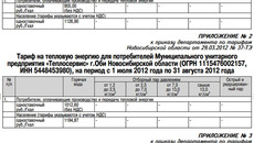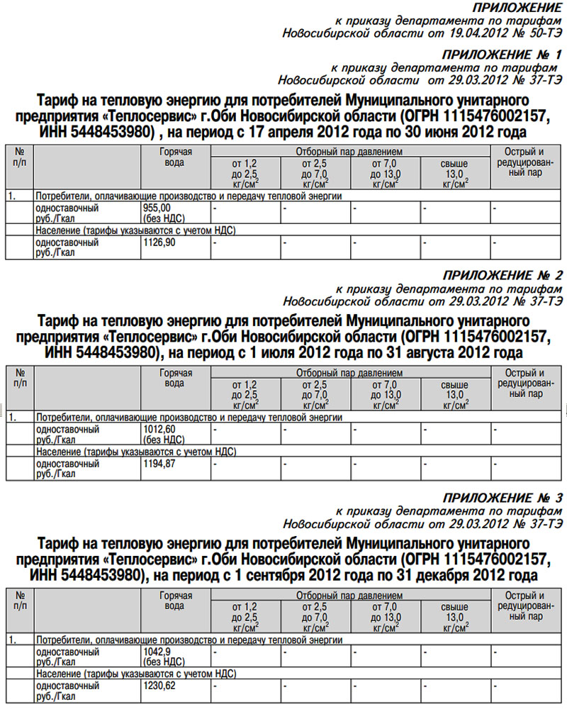 6. Внести в приказ департамента по тарифам Новосибирской области от 29.03.2012 № 37-ТЭ «Об установлении тарифа на тепловую энергию (мощность), поставляемую Муниципальным унитарным предприятием «Теплосервис» города Оби Новосибирской области потребителям», следующие изменения: приложения № 1—3 (см. таблицу 1) к приказу изложить в новой редакции согласно приложению к настоящему приказу.