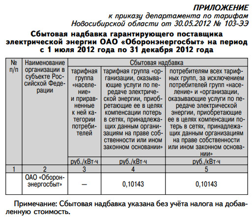 В соответствии с Федеральным законом от 26.03.2003 № 35-ФЗ «Об электроэнергетике», постановлением Правительства Российской Федерации от 29.12.2011 № 1178 «О ценообразовании в области регулируемых цен (тарифов) в электроэнергетике», Методическими указаниями по расчёту сбытовых надбавок гарантирующих поставщиков электрической энергии, утверждёнными приказом Федеральной службы по тарифам от 24.11.2006 № 302-э/5, приказом Федеральной службы по тарифам от 08.04.2005 № 130-э «Об утверждении Регламента рассмотрения дел об установлении тарифов и (или) их предельных уровней на электрическую (тепловую) энергию (мощность) и на услуги, оказываемые на оптовом и розничных рынках электрической (тепловой) энергии (мощности)», постановлением Губернатора Новосибирской области от 18.10.2010 № 326 «О департаменте по тарифам Новосибирской области», решением правления департамента по тарифам Новосибирской области (протокол заседания правления от 30.05.2012 № 20) департамент по тарифам Новосибирской области приказывает:
