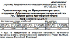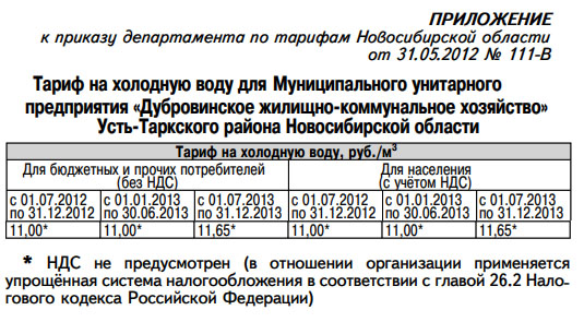 1. Установить тариф на холодную воду для Муниципального унитарного предприятия «Дубровинское жилищно-коммунальное хозяйство» (ОГРН 1115487000276, ИНН 5416104351) с календарной разбивкой согласно приложению.