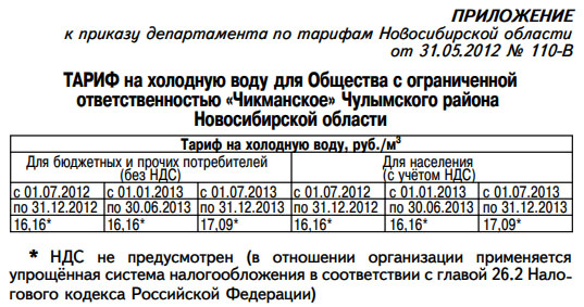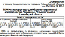 1. Установить тариф на холодную воду для Общества с ограниченной ответственностью «Чикманское» (ОГРН 1075464000182, ИНН 5442000711) с календарной разбивкой согласно приложению. (см. таблицу 1)