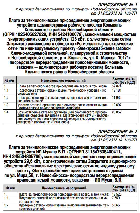 1. Установить плату за технологическое присоединение энергопринимающих устройств Администрации рабочего поселка Колывань Колыванского района Новосибирской области (ОГРН 1025405627829, ИНН 5424100079), максимальной мощностью энергопринимающих устройств 125 кВт, к электрическим сетям Закрытого акционерного общества «Региональные электрические сети» по индивидуальному проекту «Электроснабжение газовой блочно — модульной котельной, планируемой к строительству в Новосибирской области, р.п. Колывань, ул. К. Маркса, 101/1» посредством перераспределения присоединённой мощности, заказчик Администрация рабочего поселка Колывань Колыванского района Новосибирской области согласно приложению № 1(см. таблицу 1)