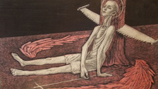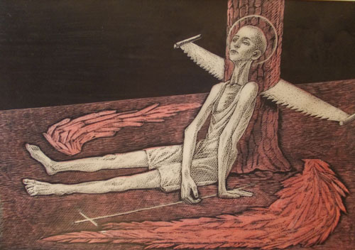 Подчас в этих обуховских провалах-прозреньях в суть вещей проявляется буквально грохочущий смелым, обличительным штрихом сарказм художника. В нем автор поднимается до философских высот обобщения и, соответственно, неприятия. Это и адская в своем потребительском сладострастии фигура «Гурмана», и поверженный силами зла «Ангел на лесоповале», и даже ряд работ из вроде бы шуточной серии «Гномы»…