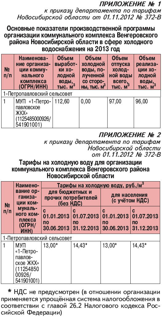 Об установлении тарифа на холодную воду для Муниципального унитарного предприятия «1-Петропавловское ЖКХ» Венгеровского района Новосибирской области на 2013 год