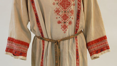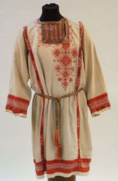 Такой же смысл вкладывали в узоры и переселенцы. Перед нами витрина с русским костюмом. Мужская старообрядческая свадебная рубаха XVIII века. По длинному — до колен — подолу, по краю рукавов, по горловине и на груди тонкой работы вышивка. Это сохранившаяся с язычества знаковая охранительная система: чтобы злые духи, в которых русский народ так или иначе все равно продолжал верить, под подол или в рукав не заползли. Важные знаки — на груди, они защищают органы дыхания, а сердце защищает обширный орнамент в левой части рубахи. Особое внимание славяне уделяли поясу.