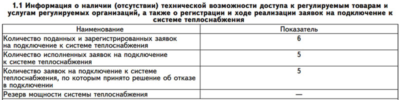 1.1 Информация о наличии (отсутствии) технической возможности доступа к регулируемым товарам и услугам регулируемых организаций, а также о регистрации и ходе реализации заявок на подключение к системе теплоснабжения (см. Таблицу 1)